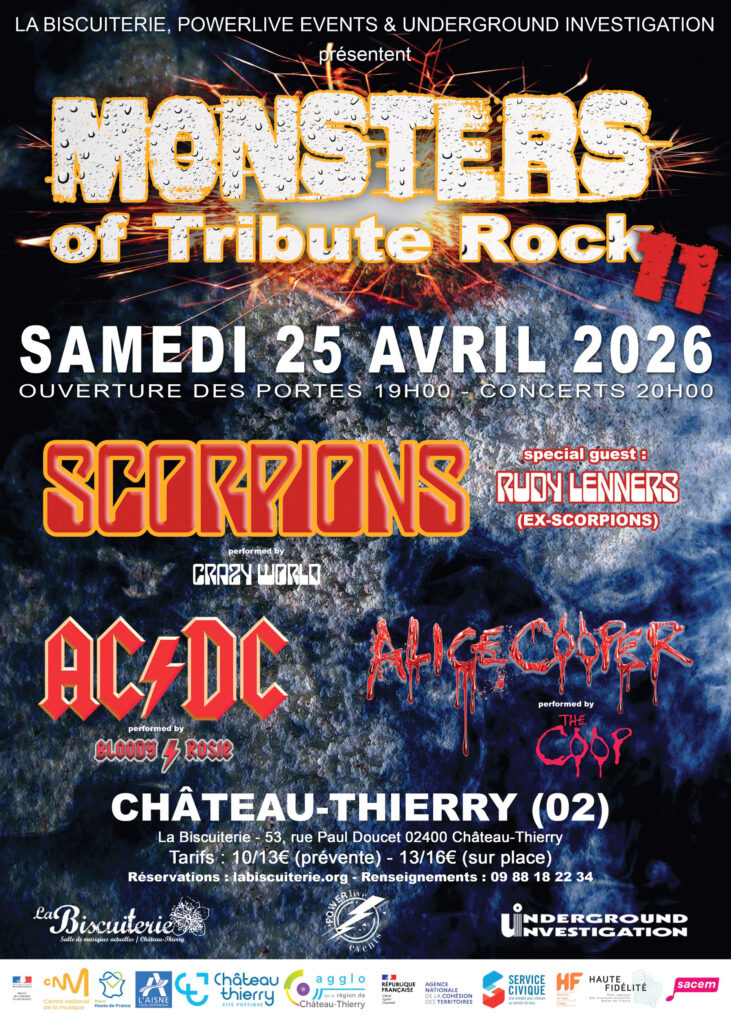 Depuis plusieurs années, les Monsters Of Tribute Rock sont devenus incontournables à « la Biscuiterie » de Château-Thierry, avec une programmation qui rend hommage aux plus grand groupes de la planète ! La 11ème édition, qui se déroulera samedi 25 avril 2026, s’annonce d’ores et déjà inoubliable, avec une affiche composée de groupes qui ont forgé la légende du Rock des 80’s !