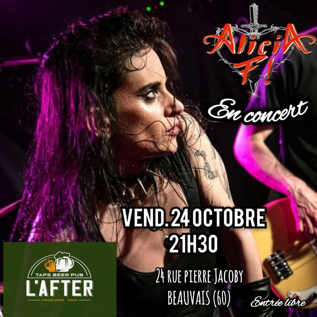 Alicia F! se produira en concert vendredi 24 octobre 2024 à « L’After » de Beauvais (60) 23, rue Pierre Jacoby à 21h30. (entrée gratuite)