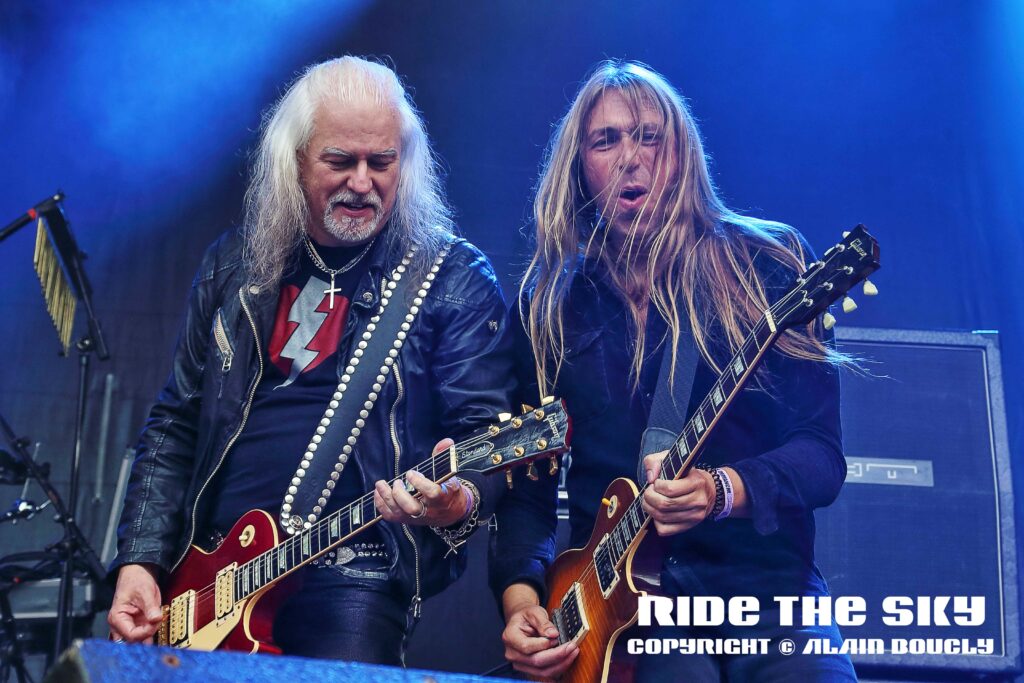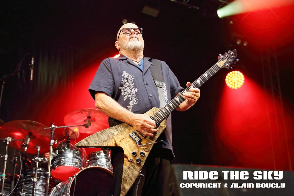 Le ton est donné dès l’entame du set de Wishbone Ash, avec « Living Proof » extrait de « Just Testing » sorti en 1980, suivi de « Runaway » et « Outward Bound » , tous deux issus du presque cinquantenaire « New England ». Le son est impressionnant de clarté, restituant parfaitement la rythmique qui propulse l’ensemble avec une sacrée efficacité. Derrière ses fûts, Mike Truscott, arrivé en 2022, trouve l’équilibre idéal entre la technicité et le côté pêchu, flirtant par moments avec des séquences plus hard d’un rock toujours efficace. Mais c’est surtout Andy Powell qui centralise toutes les attentions. Le seul rescapé de la formation d’origine est dans un grand soir. Les années n’ont pas de prise sur sa voix toujours bien placée et aux intonations d’une grande justesse. Sa Flying V envoie les accords d’une précision et d’une maîtrise inégalable, sans oublier les solos au feeling unique. On se prend à avoir a chair de poule pendant les classiques que sont « F.U.B.B. », « Warrior » ou « The King Will Come« , sans oublier le sublime « Throw Down The Sword ». Nous avons le droit à un best of retraçant la riche carrière de Wishbone Ash, qui survole les périodes allant de « Phoenix » en 1970, jusqu’à 2014 avec « Deep Blue », seul titre rescapé de « Blue Horizons ». L’alternance des chorus avec Mark Abrahams, qui a rejoint la formation en 2018, prouve à quel point l’intensité de la complicité entre les 2 guitaristes est forte, pour distiller les sonorités uniques des ‘twin guitars’, devenues la marque de fabrique du groupe. Pour conclure ce set mémorable, on retrouve avec « Blowin’ Free », tout l’univers musical de Wishbone Ash, composé de climats progressifs, suivis de tempos plus rapides, pour atteindre le final dans un déluge de notes, au cours duquel les guitares semblent se répondre par solos interposés. Quelle démonstration musicale réalisée par ce groupe d’exception, qui prend beaucoup de plaisir à jouer tout en restant au somment après tant d’années passées sur les routes. Comment ne pas être conquis devant un tel show ? Le sourire des festivaliers restés en nombre, en dit long sur la satisfaction d’avoir assisté à une prestation maîtrisée de bout en bout, bien servie par des conditions techniques optimales.