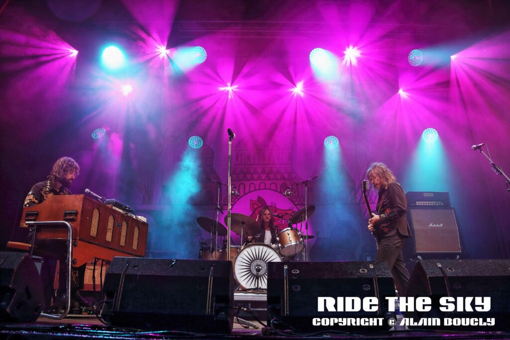 Assister à un concert de Dewolff, c’est un peu comme un retour aux sources du rock, se replonger dans les seventies pour retrouver l’essence même de la musique qui nous fait vibrer. Déjà présent sur cette même scène en 2019, le trio composé de Robin Piso à l’orgue Hammond et des frères Van de Poel, Luka à la batterie et le chanteur / guitariste Pablo. Ces derniers sont d’ailleurs à l’origine du groupe, formé en 2007 à Geleen, une province néerlandaise du Limbourg. C’est parti pour un déluge de riffs, de virtuosité de la part des 2 frangins qui s’échangent des amabilités en alternant les interventions guitare / clavier, d’une virtuosité à couper le souffle. L’absence de basse ne se fait nullement sentir, car l’omniprésence de la batterie et le mix avantageux va propulser cet ensemble agressif, tout en restant compact. Il se dégage une émotion et un feeling de tous les instants dans la jeu de guitare de Pablo, dont les notes flirtent à la fois tantôt vers les standards du Blues, tantôt vers les riffs plus agressifs version hard rock. On se demande même si certaines parties ne sont pas improvisées ! « War Pigs », la reprise de Black Sabbath en hommage à Ozzy Osbourne sera un temps fort d’un show de haut niveau qui aura marqué les esprits.