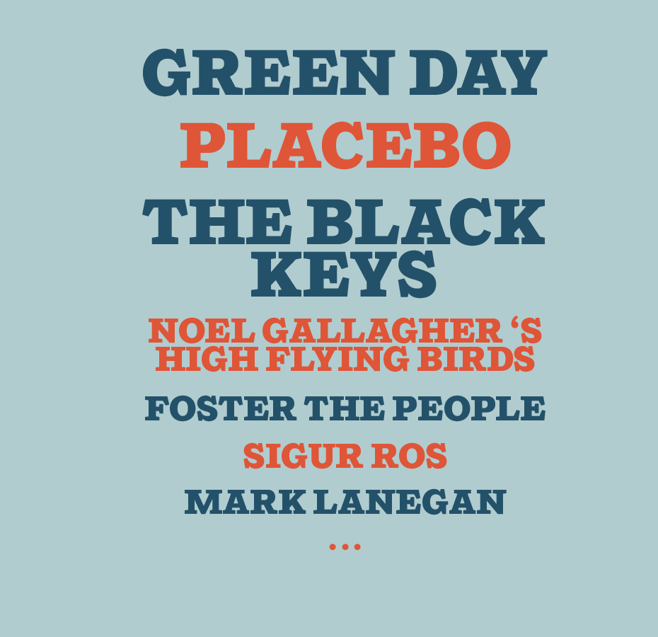 Il s’agit de Green Day, Placebo, The Black Keys, Noel Gallagher’s High Flying Birds, Forster The People, Sigur Rós, et Mark Lanegan.